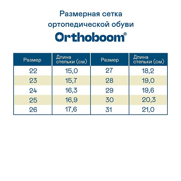 Сандали ортопедические Ортобум для мальчиков 27057-01 темно-синий бриз ОРТОБУМ Материал верха: натуральная кожа Материал подклада: кожподкладка Материал стельки: нат.кожа Вид застежки: 3 ремня (3 липучки) Материал подошвы: ТЭП Детские сандалии —  модель с продуманной конструкцией и уникальным дизайном. Инновационная анатомическая колодка, обеспечивающая правильное положение стоп, сводоформирующие стельки, а также другие ортопедические элементы препятствуют развитию плоскостопия или предотвращают дальнейшую деформацию, если патология уже выявлена. За счет широкой раскрываемости модель легко надевается и снимается без дискомфорта. Для верха используется натуральная кожа, внутри — кожподкладка, что гарантирует отличную износостойкость и правильный микроклимат. А нескользящая подошва снижает риск падения на любой поверхности. Лето в такой обуви пройдет с максимальным комфортом независимо от климатических условий. Показания к применению Начальные проявления плоскостопия. Плоскостопие 1-2 степеней. Распластанность переднего отдела стопы 1-2 степени. Реабилитация после травм и операций на стопе и голеностопном суставе. С целью профилактики для предупреждения развития патологии стопы. Подбор размера Определите размер по следующей последовательности:     1. Поставьте ногу на чистый лист бумаги.     2. Отметьте крайние границы ступни.     3. Измерьте расстояние между самыми удаленными точками стопы.     4. Найдите соответствующий размер в таблице размеров, расположенной ниже. 27057-01bar /upload/iblock/3eb/3eb9156fb5efa946f26ad26b7cbf4c86.jpg